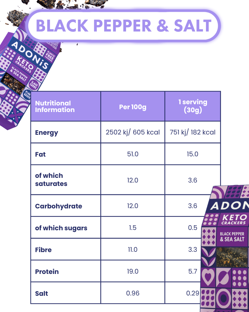Ces crackers aux graines cuites au four, au poivre noir et au sel marin regorgent de fibres et de graisses saines ! Ultra faible teneur en glucides avec seulement 2,4 g de glucides nets par cracker moyen. Dites adieu aux additifs artificiels et bonjour aux ingrédients céto purs.