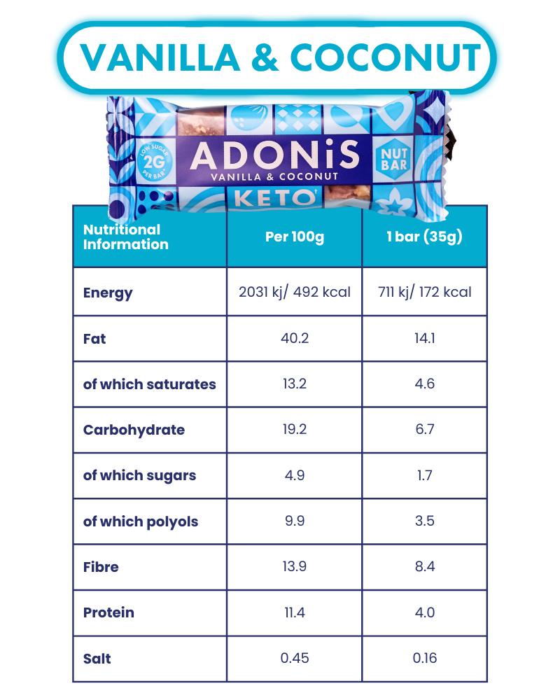Your Keto-friendly Vanilla & Coconut Nut Bar — low sugar, plant-based, high in fibre and packed with delicate coconut flavour.